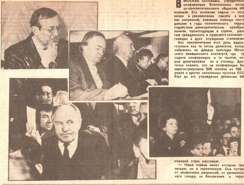 В Москве состоялась учредительная конференция Всесоюзного историко-просветительского общества «Мемориал». Его основная задача — сохранение и увековечение памяти о жертвах репрессий, оказание помощи пострадавшим в годы политического террора, содействие демократическим преобразованиям, происходящим в стране, развитию гражданского и правового сознания сограждан в духе осуждения сталинизма.