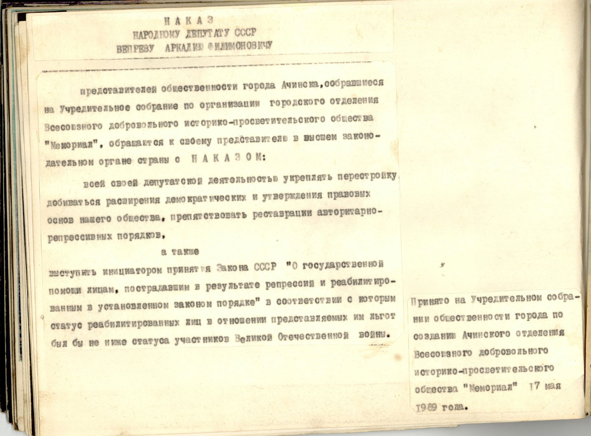 17 мая во Дворце культуры и техники имени Ильича состоялось учредительное собрание по созданию Ачинского отделения Всесоюзного добровольного историко-просветительского общества «Мемориал». Участники собрания единодушно поддержали предложение о создании общества, утвердили его устав, приняли резолюцию, в которой отражены цели, задачи и направления работы его членов, а также обращение к гражданам Ачинска. Избрано правление общества, в которое вошли представители общественности, лица, подвергавшиеся репрессиям во времена сталинщины, работники партийных, советских органов, милиции.