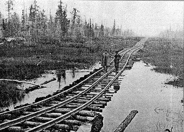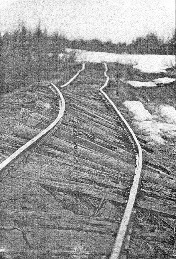 1. Железнодорожный путь, деформированный вечной мерзлотой. Май 1991 г.