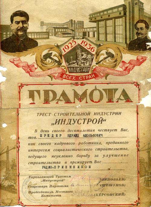 Грамота. «Трест строительной индустрии «ИНДУСТРОЙ». В день своего десятилетия чествует Вас, тов.Шредер Эдмунд Адольфович, как своего кадрового работника, преданного интересам социалистического строительства, ведущего неуклонную борьбу за улучшение строительства и премирует Вас радиоприемником.