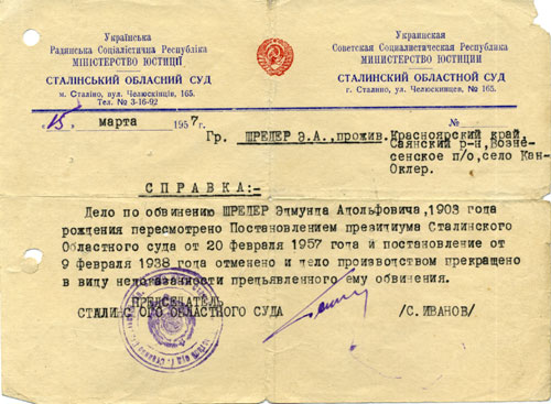 «Справка. Дело по обвинению ШРЕДЕР Эдмунда Адольфовича, 1903 года рождения, пересмотрено Постановлением президиума Сталинского областного суда от 20 февраля 1957 года и постановлением от 9 февраля 1938 года отменено, и дело производством прекращено ввиду недоказанности предъявленного ему обвинения.
