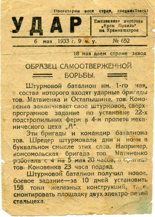 «Штурмовой батальон имени 1-го мая, в состав которого входят ударные бригады тов. Матвиенка и Остапышина, тов.Коновенка, заканчивает свое штурмовое, сверхпрограммное задание по установке 22-х подстропильных ферм в 4-м пролете механического цеха «А».
