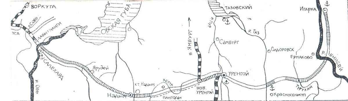 СЕКРЕТНЫМ постановлением Совмина № 1255 — 331-сс от 22.04.47 г. предусматривалось строительство в Обской губе, на Каменном мысу, крупнейшего морского порта. К нему планировалось подвести железную дорогу, которая должна была идти от уже существовавшей к тому времени Печорской магистрали (из района Воркуты). Работы были поручены Главному управлению лагерного железнодорожного строительства (ГУЛЖДС), входившему в систему ГУЛАГа.