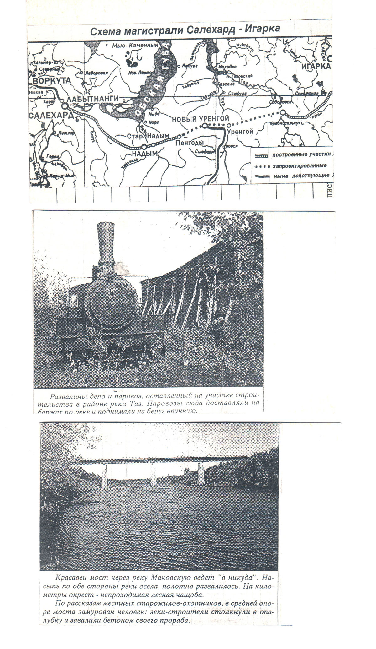 Следы грандиозного строительства сохранились до сей поры. Капризная вечная мерзлота изуродовала самым фантастическим образом деревянные мосты: одни из них вздыбились над насыпью, другие причудливо изогнулись. Заброшенные лагеря и поселки вольнонаемных утонули в наступающей со всех сторон тайге. Прямо посреди насыпи вытянулись деревья. Бывшее паровозное депо на окраине Салехарда перепрофилировано под автобазу.