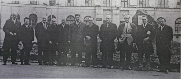 На снимке: на память с канадскими гостями. шестой слева – В. И. Долгих (Евгений Подшивалов – второй слева, на заднем плане – гостиница «Центральная», июнь 1967 года), г. Норильск.