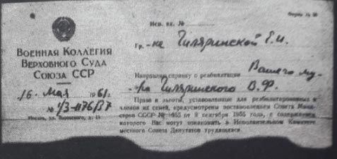 А вскоре после этого, осенью 1936 года, отца арестовали. Но сделали это как-то непонятно. Официально его перевели в Боготол на другую, более высокую должность. Виктор Гиляринский вместе с семьёй в двух вагонах несколько дней добирались до места назначения. В Боготол приехали накануне 7 ноября. Отец пошёл на станцию, чтобы узнать, где ему предстоит разместиться, но больше не вернулся.