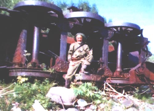 ...По проложенной мною тропе возвращаться невозможно: трава под ногами легла в сторону движения и буквально цепляется за ноги. Чтобы не идти «против шерсти», приходится параллельно торить новую тропу. Слегка уставший, возвращаюсь «на базу». За столом дружеская, непринужденная беседа продолжается. Беда изъявил желание сходить со мной к двум опрокинутым на берегу паровозам. Пятьдесят лет назад они были могучими машинами, стратегическим транспортом, символом индустриализации страны, надеждой и опорой строящейся железной дороги: именно они должны были по проложенным путям перевозить рельсы и шпалы для новых участков железной дороги. Паровозы доставляли сюда, в сибирскую глухомань, специальными баржами. Выгрузка на берег без необходимого технического оснащения, надо полагать, тоже была совсем не простой задачей. Сегодня они, как погибшие динозавры, зарастают землей и травой.
