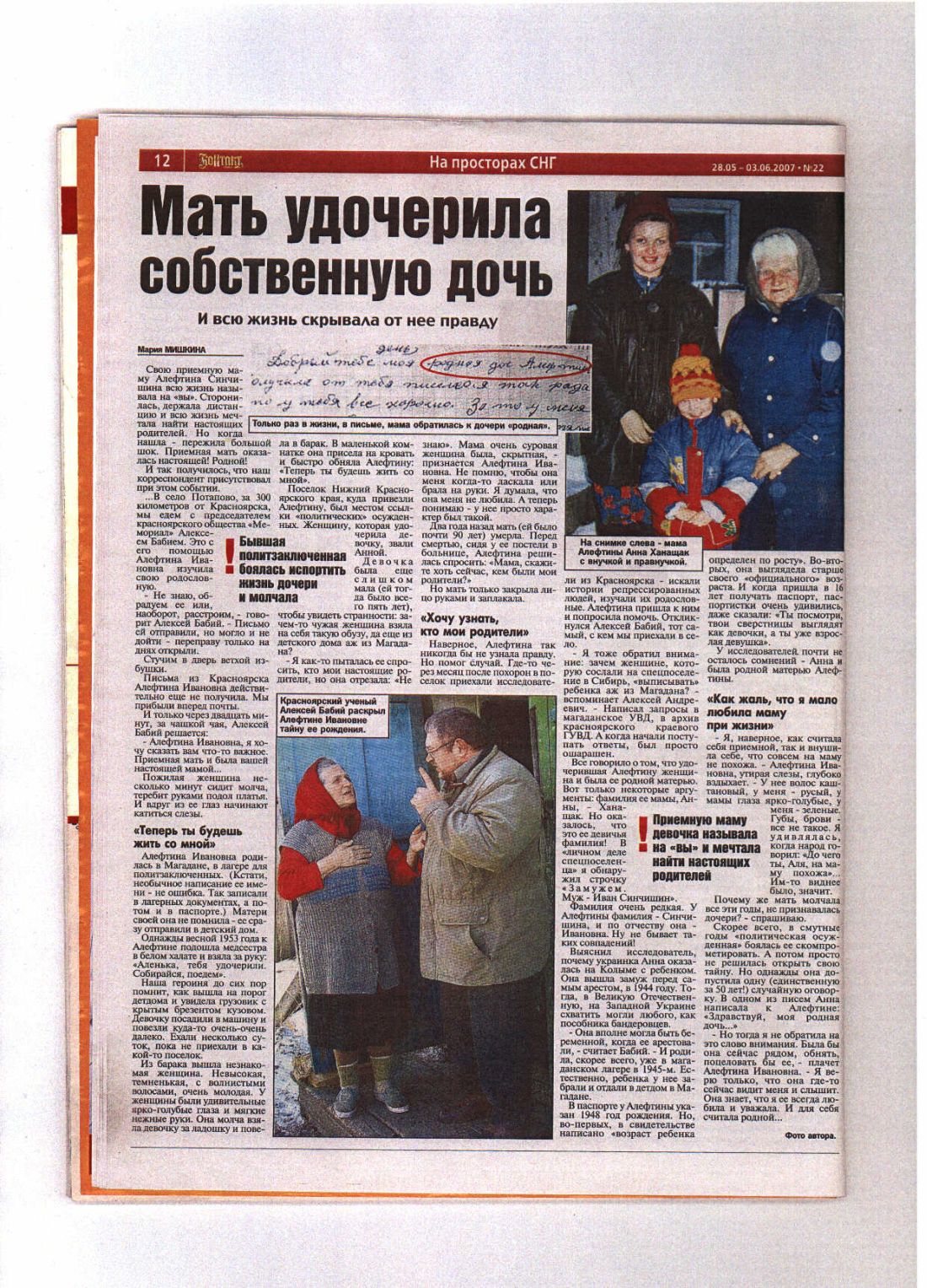 Все говорило о том, что удочерившая Алефтину женщина и была ее родной матерью. Вот только некоторые аргументы: фамилия ее мамы, Анны, - Ханащак. Но оказалось, что это ее девичья фамилия! В «личном деле спецпоселенца» я обнаружил строчку «Замужем. Муж - Иван Синчишин».
