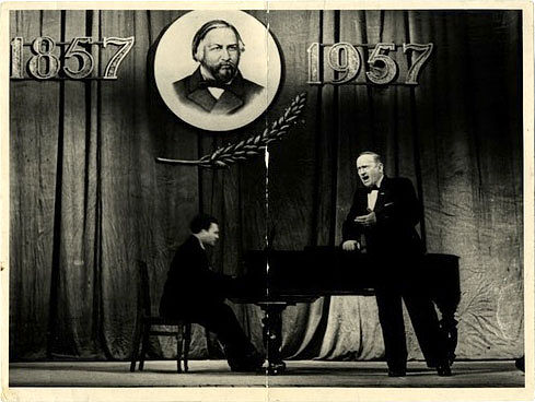 За роялем - Ананий Ефимович Шварцбург. На заднике сцены отчётливо видны даты: