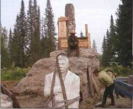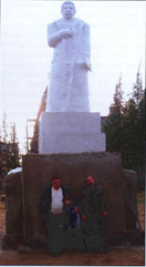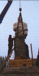 И так с одной идеей закончили. Оставался второй объект моего внимания, не менее значимый для меня, как туроператора- сгоревший пантеон. Заранее посмотрел, может ли принадлежать данный объект какому-нибудь ответственному учреждению, такому, как Игарский музей. Оказалось, что музею пантеон был вверен для сохранности (видимо так же, как и паровозы) как памятник истории, архитектуры и культурного наследия до 1998 года и на это ежегодно государством выделялись средства. Но сооружение сгорело в 1996 году. Я понял, что ничьи интересы ущемлять не буду. План был довольно прост. Вначале расчистить от Енисея до сгоревшего объекта подъем, чтобы видно было пантеон, как и раньше, от воды, с теплоходов. Облагородить прилегающую территорию, отсыпать песком, выпилить засохшие голубые ели, во-вторых на месте сохранившегося постамента памятнику Сталину, восстановить то, что там и стояло. Пусть не в том виде и качественном исполнении, как было, но изобразить что-то похожее, а главное, монументальное, чтобы народ притягивало посмотреть на такое "ничего себе" в глухой вроде бы тайге. В-третьих, решил паровоз поставить тут же неподалеку, метрах в двухстах на бетонной площадке. В-четвертых, разобрать и перенести парочку бараков из лагеря 503-й стройки. Поставить вышки, огородить колючкой, воссоздать атмосферу тех лет. Создать исторический комплекс. Потому как не каждый может пройти по 503-му маршруту. Ходили, сами знаете. Ознакомил с проектом жителей деревни. Почти все дети репрессированных, а кое-кто из них еще и жив оставался. Деревня воспряла духом, все "ЗА!" Кто уже в мыслях молоко продает, кто рыбой торгует, кто дикоросами, а кто и туристов в старом пионерском лагере расселяет (было и такое продолжение проекта) . Нью-Васюки да и только. Погрузил я в Светлогорске опять технику и пошли вниз по Курейке. Деревня такой техники и не видела никогда. Тут и "КамАЗы" 20-тонные, бульдозеры, "Кировец", японский кран. Расчистили все за три дня. Организовали песчаный карьер, отсыпали 2000 м.куб. песка, сделали планировку. Красота! Место было выбрано для пантеона нашими предшественниками не зря. С восточной стороны, с устья реки Курейка, -основной вид на пантеон. Видно примерно километров за 8-10. С севера и юга по реке Енисей за километр с каждой стороны. Чувствовалось, что приближаешься к чему-то важному. Даже разрушенный пантеон не портил ощущения значимости этого места. Место освещается солнцем в любое время дня и продуваемое. Оставалось перейти ко второй части проекта- установить памятник тому, кто уже здесь однажды стоял, правда, в другом исполнении, но на оставшийся от него, от прежнего хозяина, пьедестал, т.е. поставить туда, "откуда взяли".