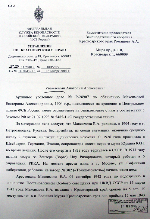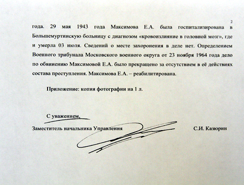 Дело Екатерины Максимовой хранится в архивах ФСБ. Несколько месяцев назад краевые депутаты отправили в ведомство запрос с просьбой предоставить дело ссыльной. На днях в Красноярск пришел ответ за подписью руководителя ФСБ Александра Бортникова: гриф секретности с дела до сих пор не снят.