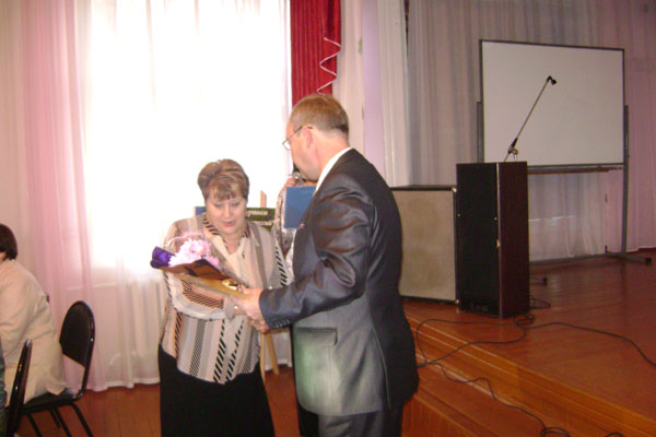 Глава района Е.Д.Дмитриев вручает Благодарность руководителю УСЗН Т.Н.Великих