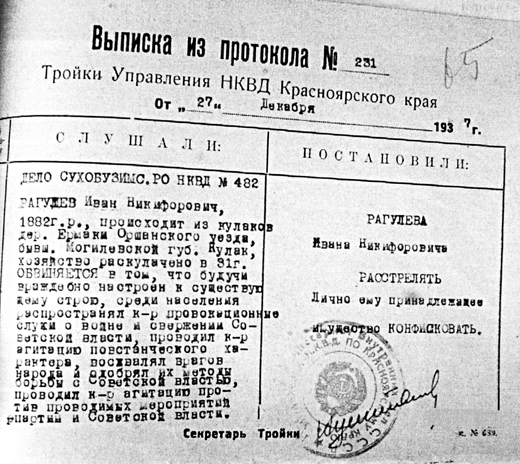 Поначалу Красноярскому краю спустили план по первой категории в 750 человек (первая категория означала расстрел). Но властям этого показалось мало. По их просьбе 20 августа 1937 года И. В. Сталин "исправил ошибку", увеличив "лимит" на 6 600 человек.