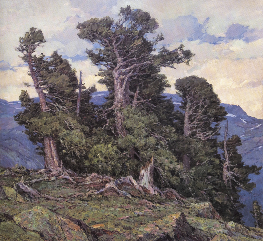 На фото: Тойво Васильевич Ряннель в своей мастерской, 2007 год; Горные Кедры. 1959 год, холст, масло.