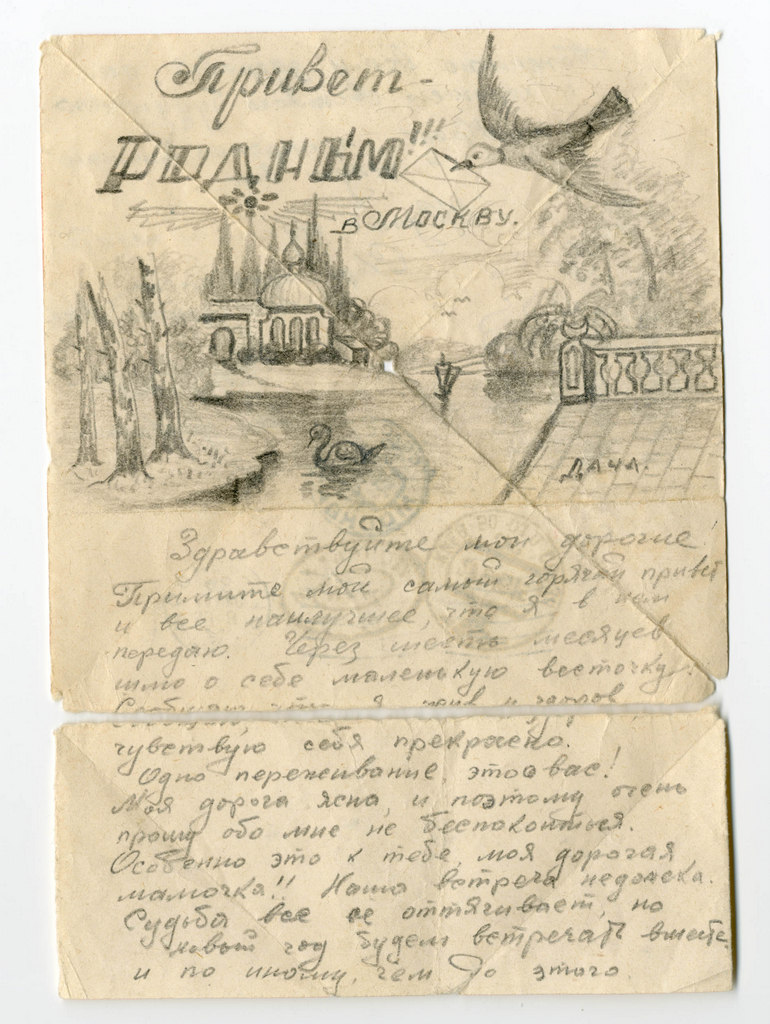 ...На дворе конец августа 1948-го. Столыпинский вагон с заключенными остановился в Киеве на задворках станции. Лев Нетто, раздобыв бумагу и карандаш, пишет письмо родным, старательно украшая его наивным рисунком вроде почтовой открытки.