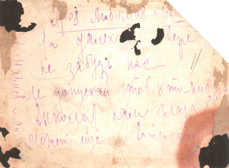Эти слова своей дочери Инне писал Ионатан ДИСТЕРГОФТ. В 1937 году по обвинению в создании антисоветской организации он был приговорён к 10 годам. Попал в Амурлаг, затем этапирован в Сороклаг (Коми АССР). Жену Дистергофт Марию Дмитриевну арестовали в августе 1941 года по подозрению в антисоветской агитации. А Инну отчислили из мединститута как дочь врага народа. Ионатан Готлибович писал дочери трогательные письма в стихах, а однажды на обороте своей фотографии сделал предостережение: «На далёком Севере не забудь нас и не допускай, чтобы кто-нибудь выколол нам глаза. Может, ещё и встретимся». В то время нередко на фотографиях выкалывали глаза «врагам народа». В декабре 1941 года Дистергофт умер в лагере, а реабилитирован был лишь в 1955 году.