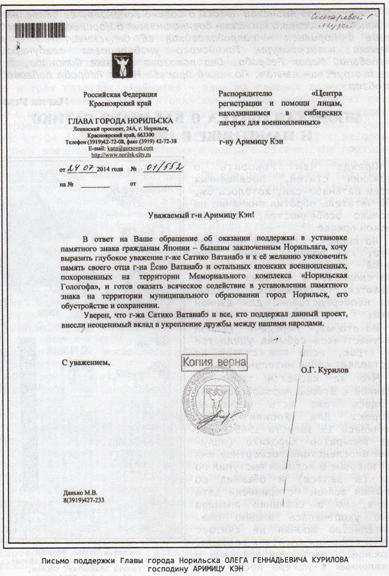 P. S. Японская делегация встречалась с главой Норильска Олегом Куриловым. Гости также посетили мемориальный комплекс на “Голгофе”, побывали на медном заводе, совершили экскурсии по другим памятным местам Норильска, встречались с общественностью заполярного города.