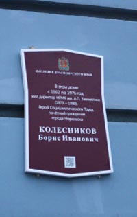 В Норильске выбор пал на двух почетных граждан города — Бориса Ивановича Колесникова и Петра Трофимовича Жмурко. Мемориальную доску Борису Колесникову (уже вторую, первая размещена в фойе АБК «Надежды») открыли на здании, где он долгое время жил — Ленинский проспект, 5 (универмаг «Талнах»). Мемориальный знак в честь Петра Жмурко установили на здании АБК рудника «Заполярный» — здесь начинался его горняцкий трудовой путь и этим предприятием он впоследствии руководил.