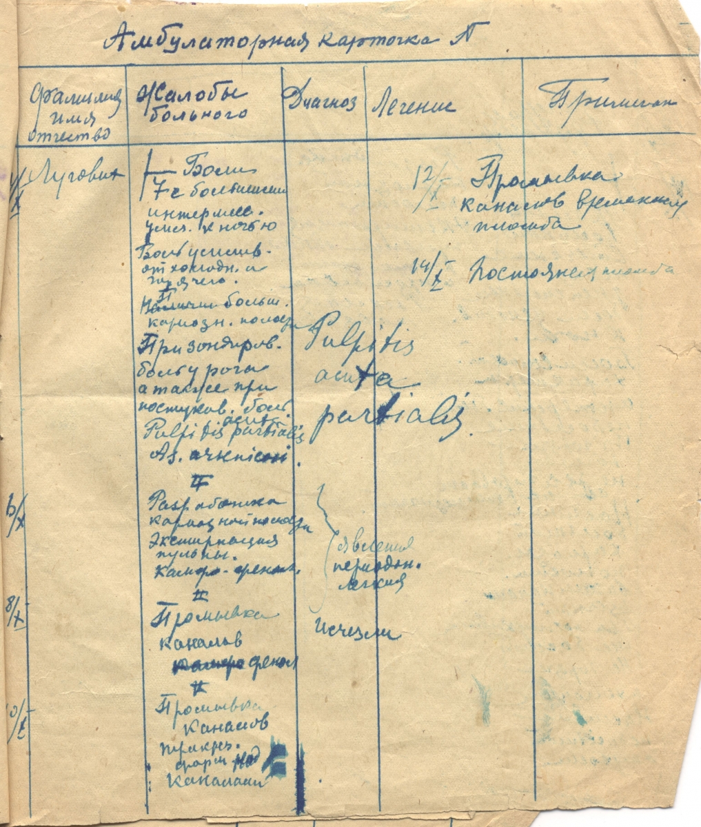 В итоге она устроилась санитаркой в больницу. Через некоторое время она попросила прислать ей диплом зубного врача, учебники. И начала заново учиться лечению зубов. Из Енисейска она переехала в Подтёсово – там завод был, точнее, затон, где ремонтировали суда, и там она работала баржевым маляром, надписи писала, её подымали в люльке. Она говорила, что думала тогда: «Слава богу, что я здесь крашу баржи, а не кричу со всеми „ура-ура"». В Подтёсове её взяли на работу в зубной кабинет сначала санитаркой, медсестрой и, в конце концов, доверили лечить зубы. Даже сохранились написанные ею амбулаторные карты с диагнозами и назначениями. Она всегда с благодарностью вспоминала своего главного врача как потрясающе опытного стоматолога, тоже ссыльного. Звали его Володя Горбов. К нему на приём стремились попасть люди чуть ли ни со всего Енисейского района. Он взял её под своё крыло и помог заново овладеть профессией. Там она проработала до переезда в Караганду. И вот весной 1956-м года маму реабилитировали, и она вернулась в Москву.