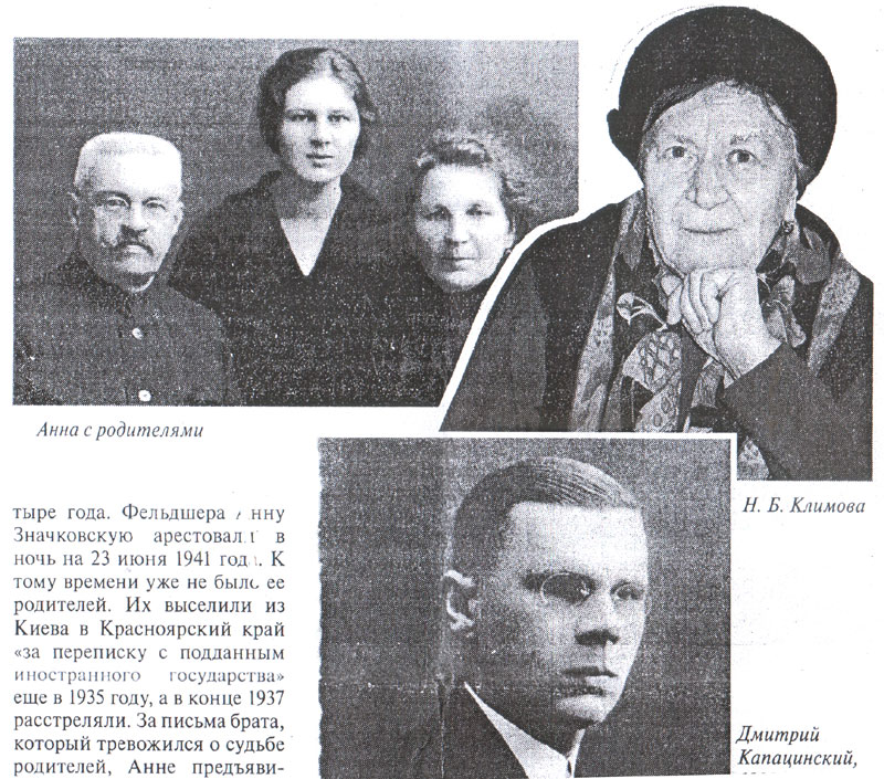 Ранних воспоминаний о матери Наташа не сохранила: их разлучили, когда девочке едва исполнилось четыре года. Фельдшера Анну Значковскую арестовали в ночь на 23 июня 1941 года. К тому времени уже не было ее родителей. Их выселили из Киева в Красноярский край «за переписку с подданным иностранного государства» еще в 1935 году, а в конце 1937 расстреляли. За письма брата, который тревожился о судьбе родителей, Анне предъявили обвинение уже не просто в связи с иностранцем, а со шпионом.