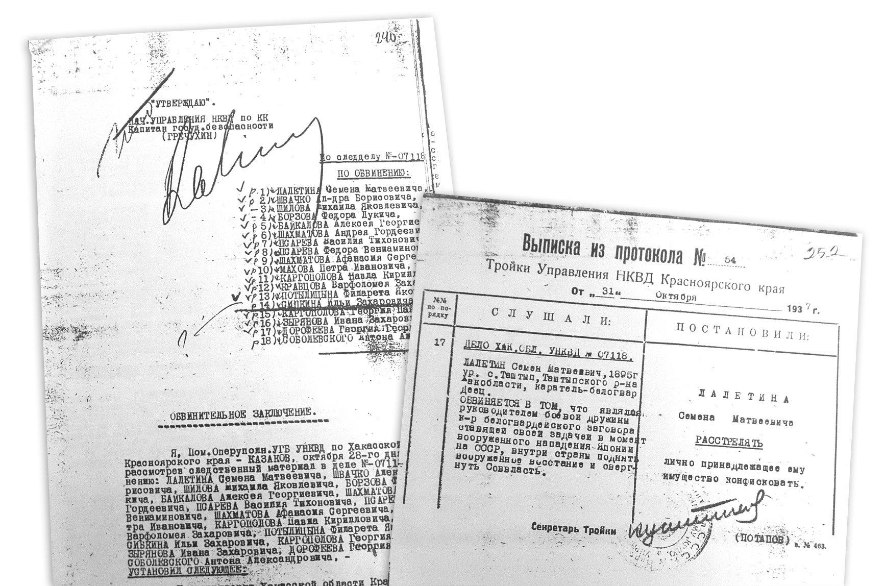 По сфабрикованному обвинению расстреляны 13 бывших казаков из станиц Таштып и Нижний Имек и прииска Анзас Минусинского уезда: С. М. Лалетин, А. С. Шахматов, П. К. Каргополов, Г. П. Каргополов, В. Э. Кравцов, И. З. Зырянов, В. Т. Псарев, А. Г. Шахматов, Ф. Я. Потылицын, И. З. Сипкин, А. Г. Байкалов, А. А. Соболевский, П. И. Махов. Двое "фигурантов" этого же дела - Ф. Л. Борзов и М. Я. Шилов - получили по 10 лет лагерей (на снимках - материалы этого дела).