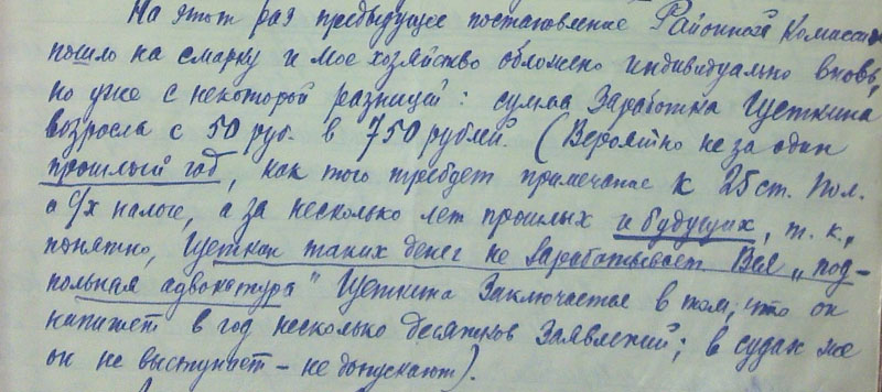 Конечно, власти не понравилось, что подданный вдруг стал гражданином. И власть нашла изящный ответ. Написание таких заявлений было названо «подпольной адвокатурой», «нетрудовыми доходами». А нетрудовой доход — основание для лишения избирательных прав и обложения индивидуальным налогом, который рассчитывался весьма произвольно. Некоему Щёткину из Абанского района, например, вменили доход 750 рублей в год — только за «адвокатуру», не считая прочего. А хозяйство признавалось зажиточным, если у него доход был больше 500 рублей в год, так что «сельский адвокат» попал сразу в «кулаки», минуя стадию «подкулачника». Не знаю, брали ли деревенские адвокаты на самом деле плату за эту работу, или помогали односельчанам бесплатно, но только власть очень быстро отбила охоту с ней судиться.