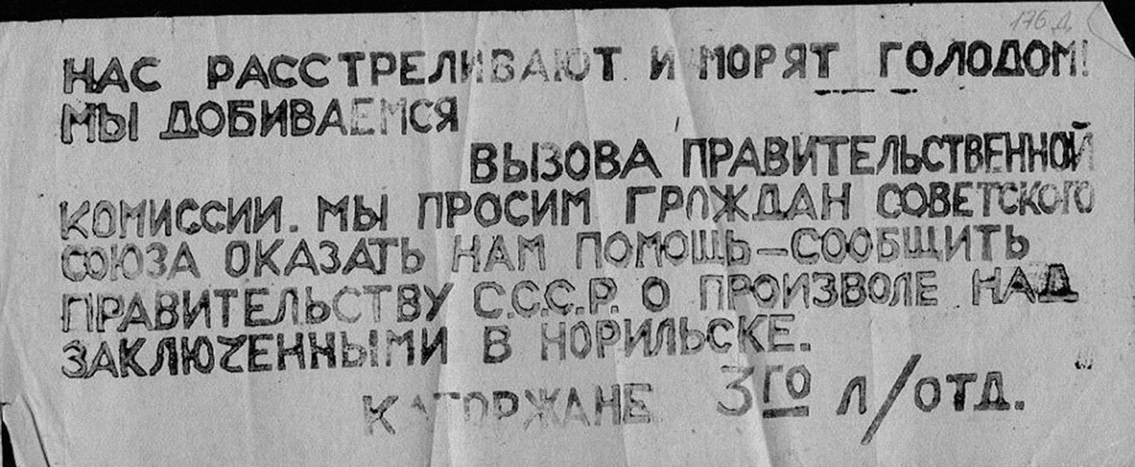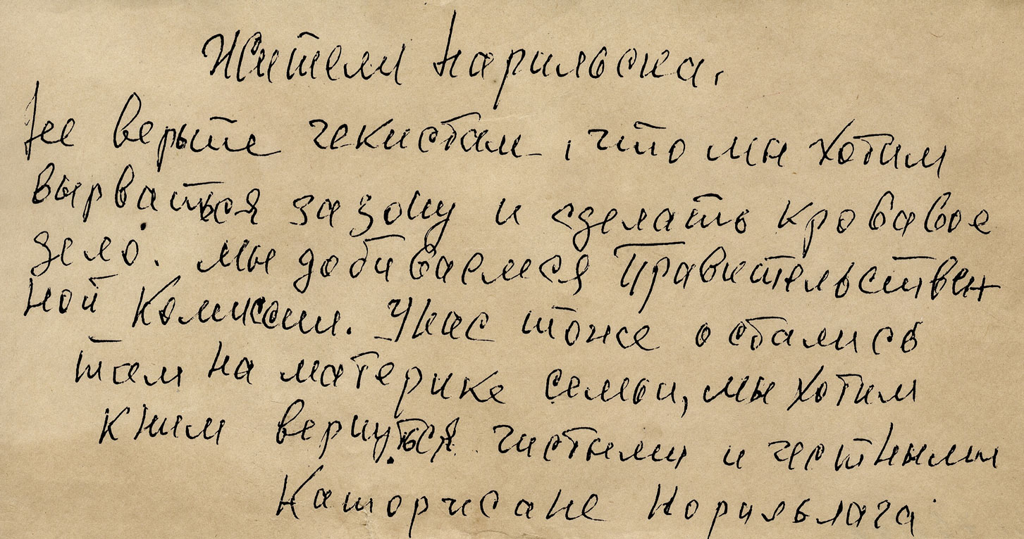 — Каждый из нас отбыл уже в среднем по 7-9 лет заключения. На протяжении этих долгих лет заключения мы, находясь в суровых климатических условиях Заполярья, где по советским законам об охране труда каждому трудящемуся предоставляются льготы в виде удвоенного отпуска, повышенной заработной платы и много других, мы в этих условиях, работая по 10 часов в сутки очень долгое время, ничего не получая за наш тяжелый каторжный труд, не имея никаких льгот, все же построили в Норильске целый ряд предприятий союзного значения. (Посмотрите: все это построено нашими руками!).