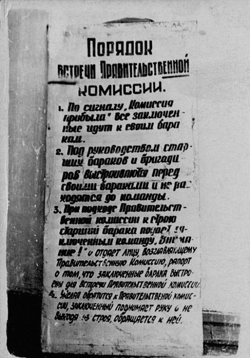 3. При подходе Правительственной комиссии к строю старший барака подает заключенным команду «Внимание!», и отдает лицу, возглавляющему Правительственную комиссию, рапорт о том, что заключенные барака выстроены для встречи Правительственной комиссии.