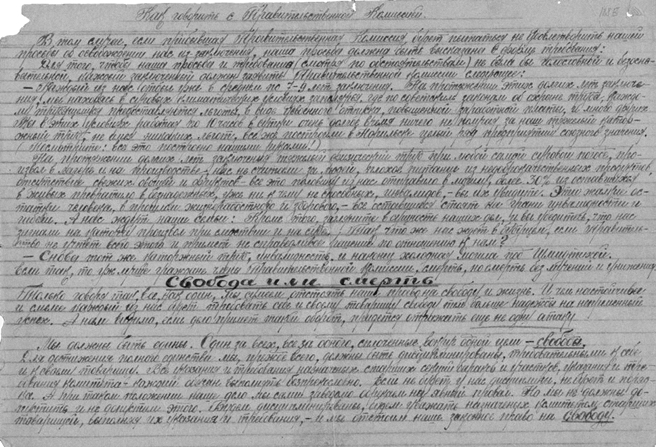 В том случае, если прибывшая Правительственная комиссия будет пытаться не удовлетворить наши просьбы об освобождении нас из заключения, наша просьба должна быть высказана в форме требования: