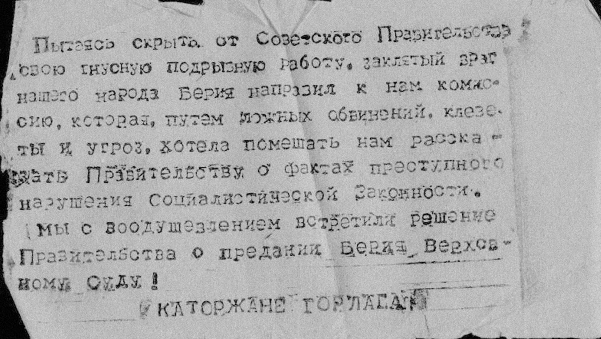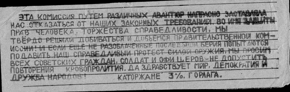 На протяжении долгих лет заключения тяжелый физический труд при любой самой суровой погоде, произвол в лагере и на производстве, нас не считали за людей, плохое питание из недоброкачественных продуктов, отсутствие свежих овощей и фруктов — все это половину из нас отправило в могилу, более 30% из оставшихся в живых превратило в безнадежных, уже ни к чему неспособных инвалидов, — вы их увидите. Это жалкие остатки человека, в прошлом жизнерадостного и здорового, — все оставшиеся стоят на грани инвалидности и гибели. А нас ждут наши семьи: Кроме того, загляните в сущность наших дел, и вы убедитесь, что нас загнали на каторгу произвол при следствии и на суде. Так что же нас ждет в будущем, если Правительство не учтет всего этого и примет несправедливое решение по отношению к нам?
