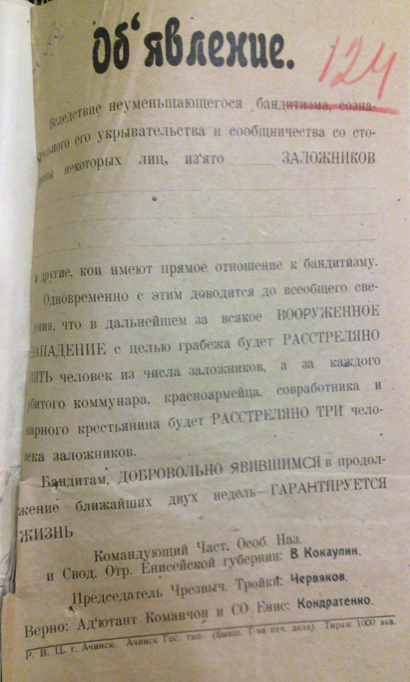 Бесконечные ЧОНовские (ЧОН — части особого назначения. — Ред.) приказы о расстрелах заложников страшны не наличием несовершеннолетних. Объявление напечатано в типографии, подписывается только название села и количество заложников. Это не исключение, а система.
