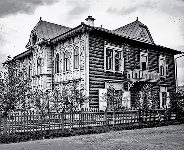 Высокое двухэтажное рубленое деревянное строение Г-образное в плане, под четырёхскатной вальмовой железной крышей, на ленточном фундаменте, возведено по проекту В. А. Соколовского в стиле модерн в 1909 – 1910 годах.