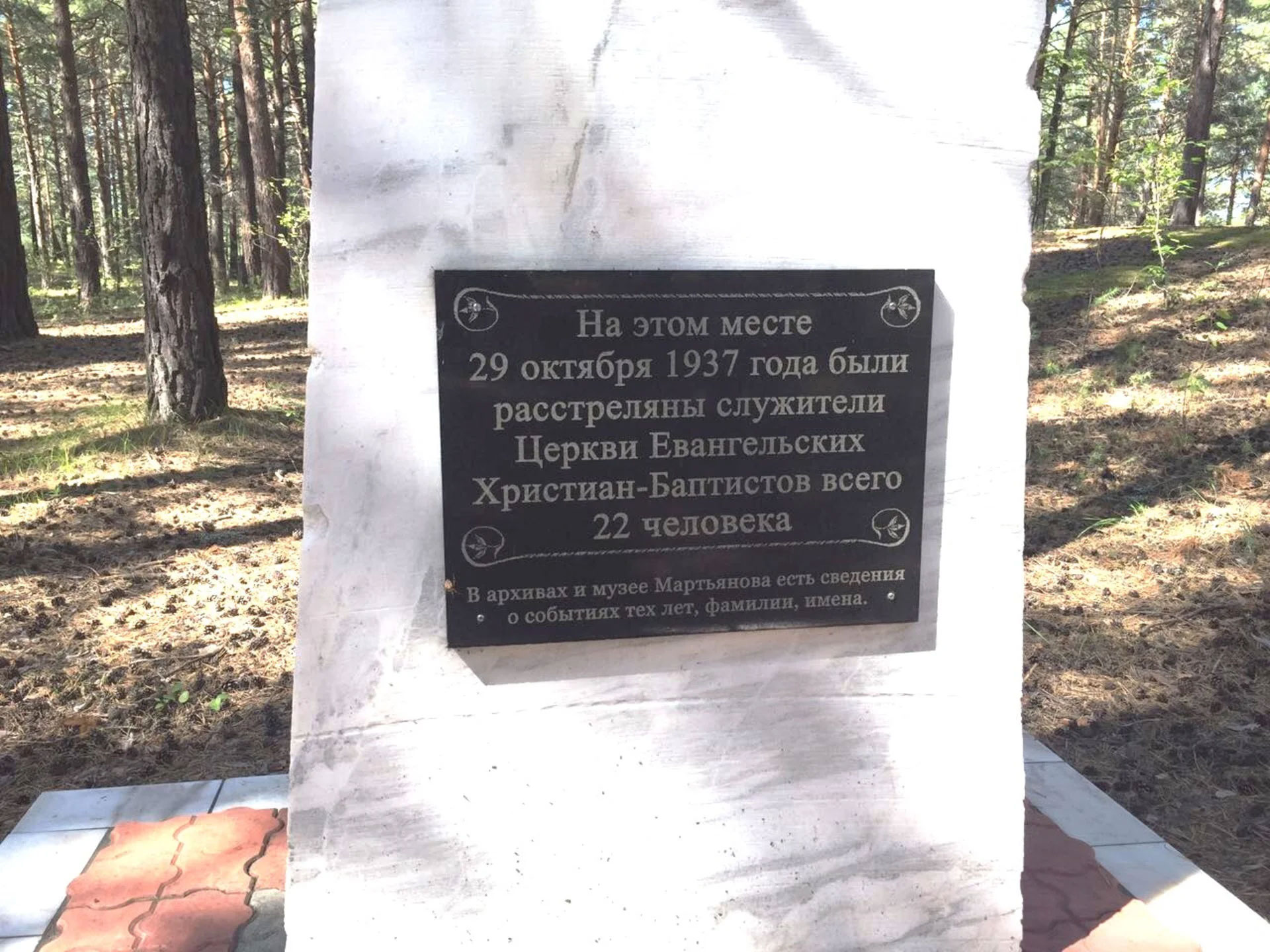 Здесь, неподалеку от города Минусинска, в величественном сосновом бору покоится прах наших братьев - служителей церкви Христовой, расстрелянных в тридцатых годах. Мы с почтением вспомнили подвиг веры тех, кто отдал жизнь за своего Господа, оставшись верными Ему до смерти. В искренней молитве вознесли благодарность Богу за их стойкость и мужество, которые они проявили, потому что это лучший памятник и прекрасный пример для подражания.
