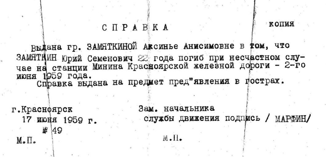 То есть — красноярцы. Следом еще случайная находка: при описи архива нотариальной конторы Ленинского района Красноярска найдены свидетельства о праве на наследство от июля 1959 года. Даты всех смертей — 02.06.1959, наследники — родители, наследство — страховые выплаты по несчастному случаю (3000 рублей).