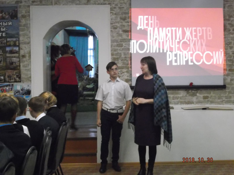 Перед участниками встречи выступили учащиеся школ поселка Е.Монина и А.Каминский, которые рассказали о периоде репрессий.