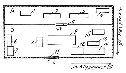 А – жилая и бытовая зоны заключённых: 1 – бытовое помещение (парикмахерская,