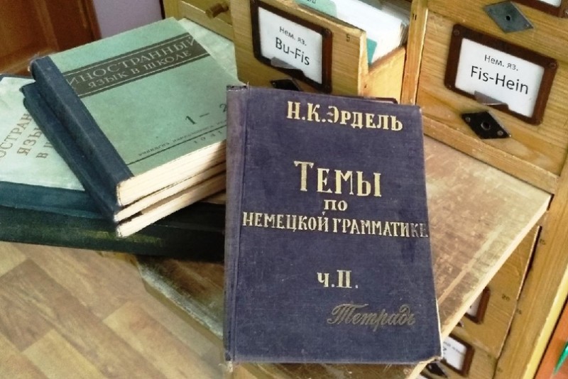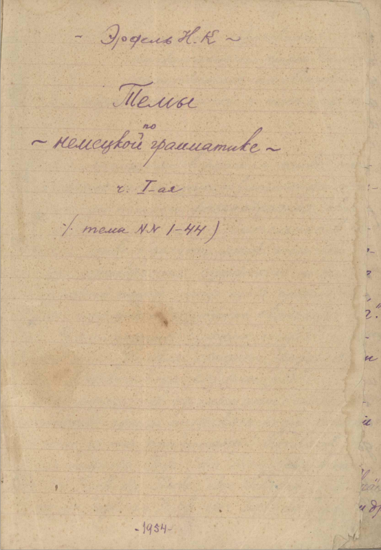 Недавно в библиотеку принесли рукопись. Две небольшие тетради в коленкоровых черных переплетах исписаны рукой ссыльного Николая Карловича Эрделя, профессора Ленинградского пединститута им. Герцена, автора «Нового учебника немецкого языка», выходившего до и после революции множеством переизданий. По его учебникам учились в вузах и школах. В каталогах РГБ и РНБ находится 37 и 21 книга авторства Эрделя: помимо учебников и метод. пособий, он подготовил в 1910-х годах сборники рассказов и стихотворений немецких писателей.