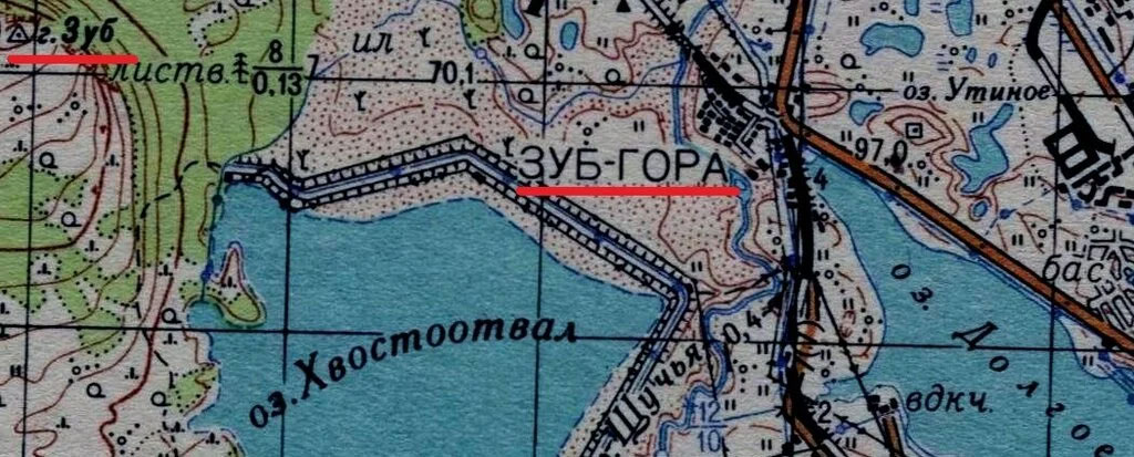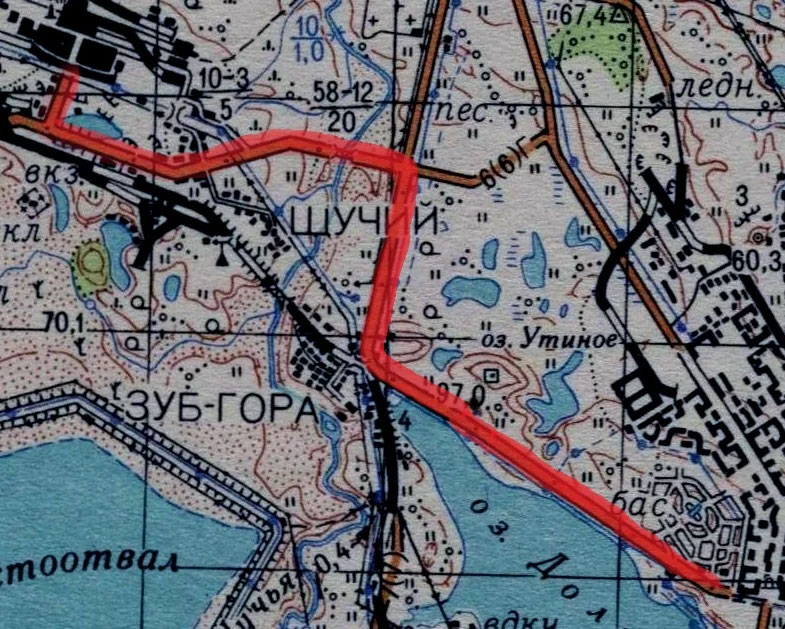 Конечно же, меня заинтересовало упоминание об автодороге вдоль берега озера Долгое до посёлка Зуб-Гора и далее на Медный завод. Вероятно, речь шла о маршруте, отмеченном мной на фрагменте карты 1961 года.