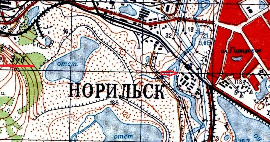 Совсем небольшой материал про барачный посёлок ЗУБ-ГОРА. Несмотря на то, что упомянутое название достаточно общеупотребительно и по сегодняшний день, считаю необходимым сделать незначительную оговорку. Гора Зуб, высотой 202,2 метра, хорошо заметна практически с любой точки наблюдения, расположенной на западной и юго-западной окраине Норильска, однако местоположение барачного посёлка никак нельзя обозначить как "у подножия горы" или, тем более, "на склоне горы", что достаточно хорошо заметно на картах разных лет.
