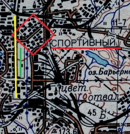 Фрагмент схемы 1943 г. Желтым отметил будущую ул. Энергетическая, зелёным -