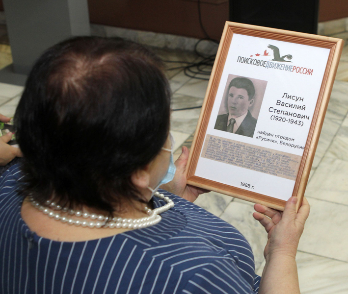 Среди тех, кому сегодня передали памятные вещи - семья Василия Степановича Лисуна, погибшего в Белоруссии под Оршей. Его поисковики нашли еще в 1988 году, но тогда родственников найти не удалось. Однако благодаря помощи руководителя общества «Мемориал» Алексея Бабия и инспекторов Отдела по вопросам миграции ОП № 4 МУ МВД России «Красноярское» удалось не только найти родных, которые живут в Красноярске, но и узнать о семье Василия Степановича. В ней до сих пор бережно хранят портрет дяди, а в последние годы пытались найти информацию о нем.