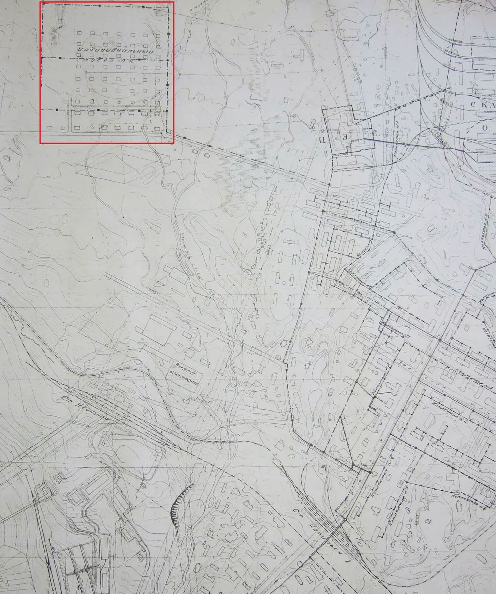 На данной схеме предполагаемое место нахождения 11го лаготделения обозначено как поселок Индивидуальный. Приведенный далее рассказ жителя поселка не позволяет однозначно утверждать, что поселки Заозерный и Индивидуальный одно и тоже место, хотя и находились близко друг от друга. Вероятно, будущий Заозерный это "...лагерь, который стоял на горе" и находился северо-западней от поселка Индивидуальный.
