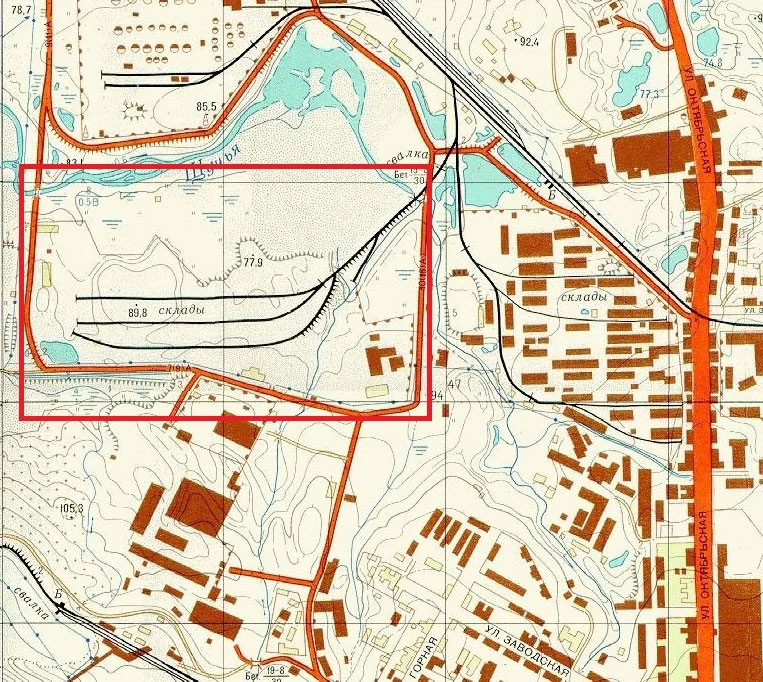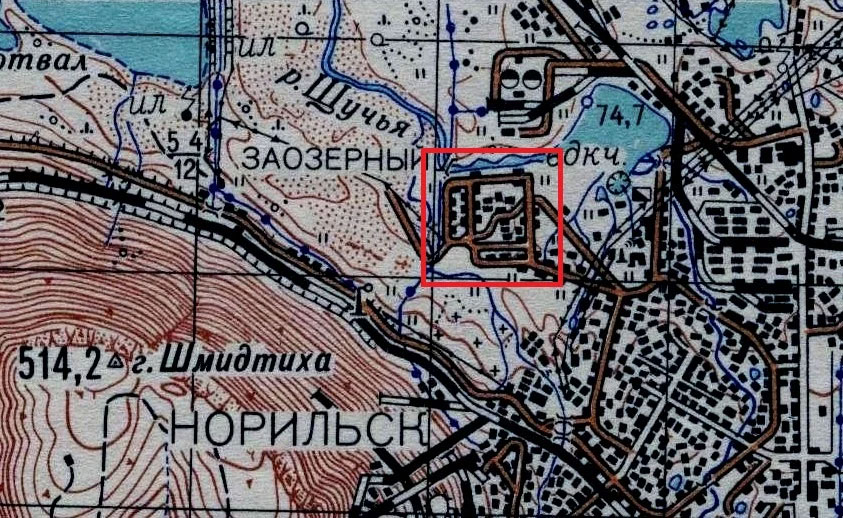 На карте 1975 поселок Заозерный не обозначен, большую его часть заняла контейнерная площадка Норильскснаба, в этом же районе располагался гараж Управления торговли Норильского комбината.