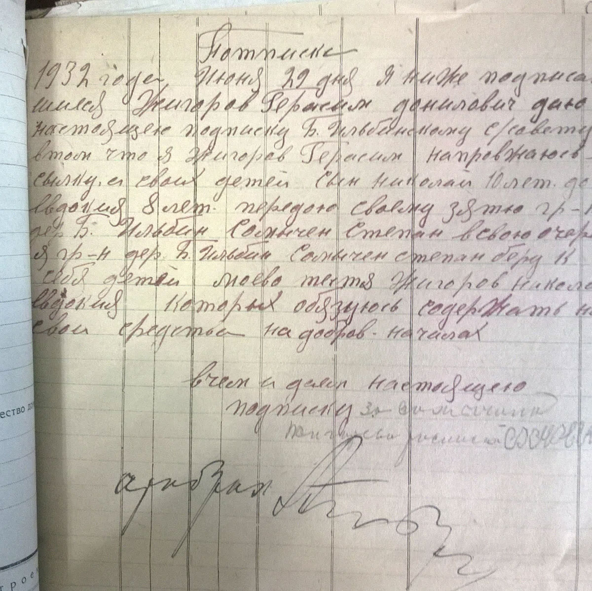 «Я, нижеподписавшийся, даю настоящую подписку сельсовету в том, что я направляюсь в ссылку, а своих детей передаю такому-то. Я, такой-то, беру к себе детей, таких-то, которых обязуюсь содержать на свои средства на добровольных началах. В чем и даем настоящую подписку».