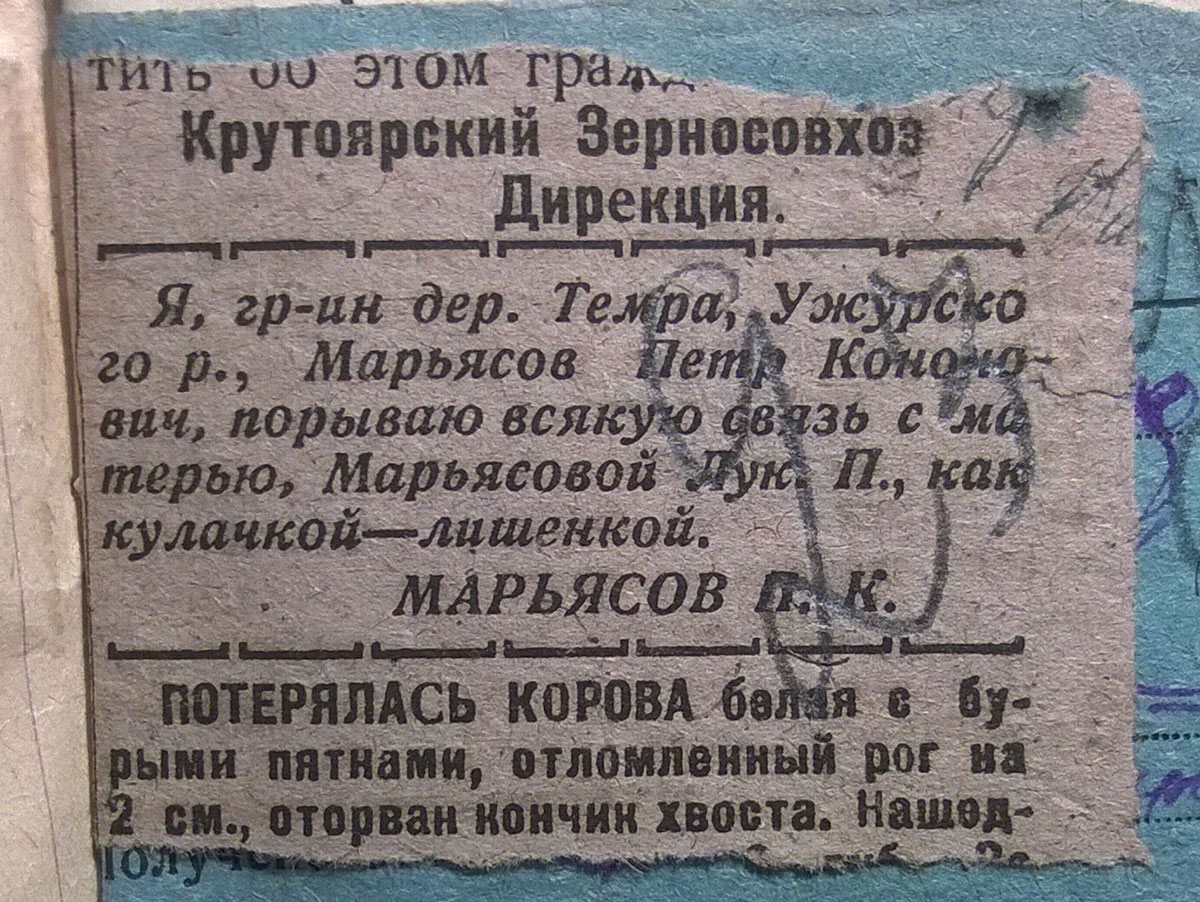 Мы давали эти вырезки из советских газет с отказами от матерей и отцов, от сыновей и дочерей. Эти написанные собственноручно просьбы зафиксировать отказ от родителей и принять в колхоз «Путь к социализму».