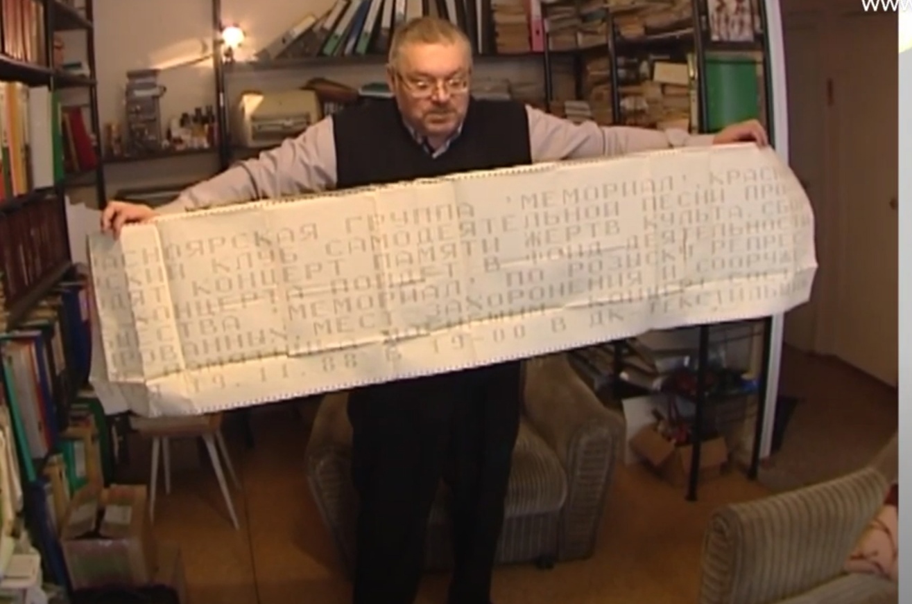 На таких лентах ранее делали объявления. Например, 19 ноября 1988 г. на такой ленте сделали объявление, что в ДК «Текстильщик» состоится концерт самодеятельной песни «Памяти жертв культа личности». Тогда вся информация собиралась вручную. В офисе были необработанные кипы папок, в которых были вырезки из газет тех лет, статьи о «Мемориале», репрессиях и подлинные документы, которые приносили люди.