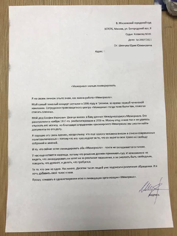В обращении к судье лидер группы «ДДТ» заявил, что общественную организацию и правозащитный центр нельзя ликвидировать. Желание Генпрокуратуры закрыть «Мемориал»* не укладывается у Шевчука в голове.
