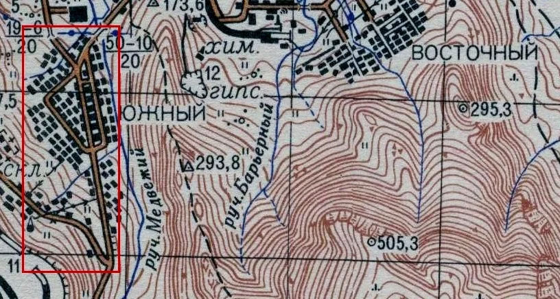 На карте 1961 года территорию посёлка Южный обвел красной рамкой. Даже если принять во внимание масштаб и условность карты, то количество построек в посёлке составляет около 30 зданий и бараков!