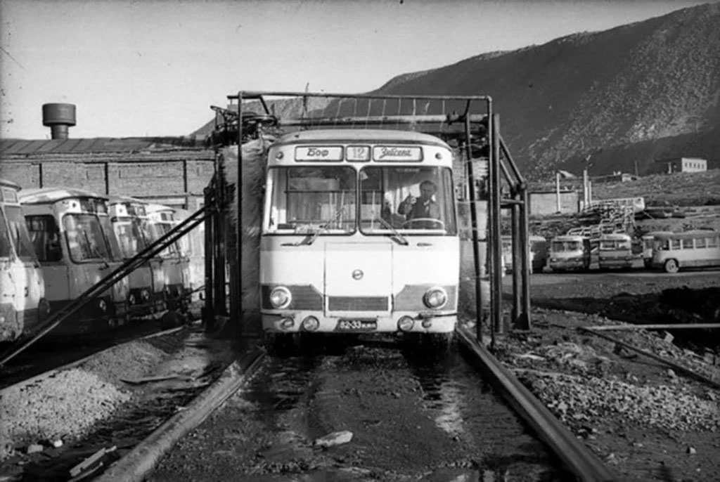 Автобусы НПОПАТ, начало 1980х. У правого края на склоне видны остатки посёлка Южный.