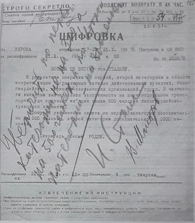Сохранилась телеграмма И. В. Сталина, посланная им всем региональным руководителям ВКП(б) и управлений НКВД краёв и областей: